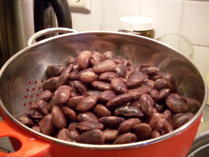 ACHTUNG : Die Bohnen müssen immer mit Wasser bedeckt sein, sonst werden sie ungleich gekocht! Danach abseihen, dabei das Wasser auffangen und in einen Topf geben.