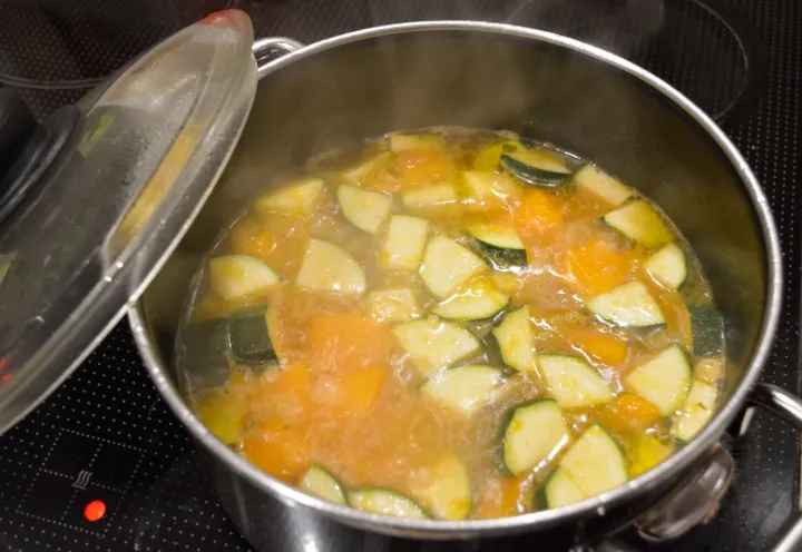 Kürbis in mittelgroße stücke schneiden, restliches Gemüse klein schneiden. Zwiebel und Knoblauch im Öl anschwitzen, Kürbis, Karotte und Lauch zufügen. Mit Suppe ablöschen und ca. 10 Minuten kochen lassen. Zucchini zugeben und ungefähr 5 Minuten weiterkochen lassen. Tomaten und Thymian zugeben und eine weitere Minute köcheln lassen. Abschmecken und mit Basilikum bestreut servieren.