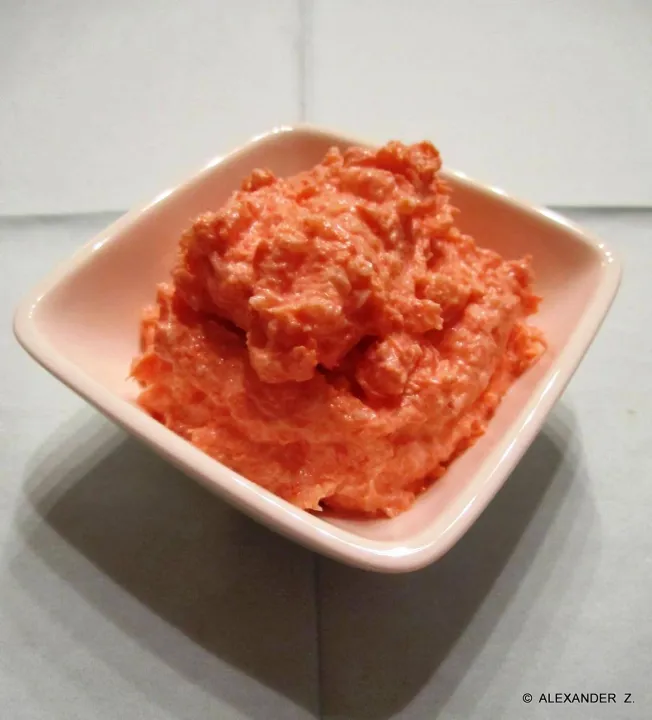 Den Topfen in eine kleine Schüssel geben. Anschließend den in Öl eingelegten Hackschnitzel-Lachs in einem Metallsieb mit einem Teelöffel gut auspressen und zum Topfen dazugeben. Nun noch einen Teelöffel Zitronensaft und die fein gehackte Zwiebel untermengen.
