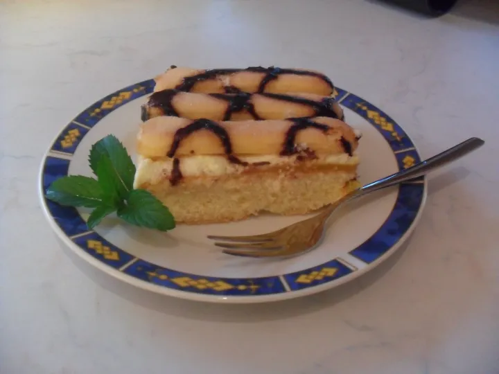Überkühlt mit Pudding bestreichen, erkaltet die geschlagene Sahne darüber geben, getränkte Biskotten auflegen und mit Schoko Linien spritzen.