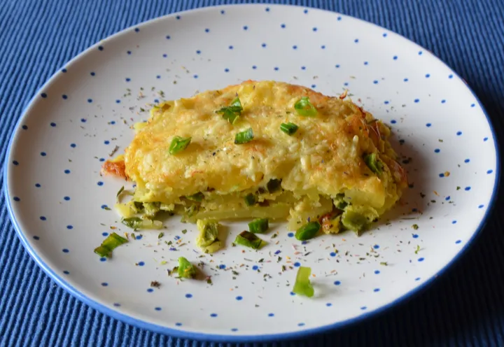 und im vorgeheiztem Backrohr bei 200° backen bis Überguß gestockt und Käse golden ist