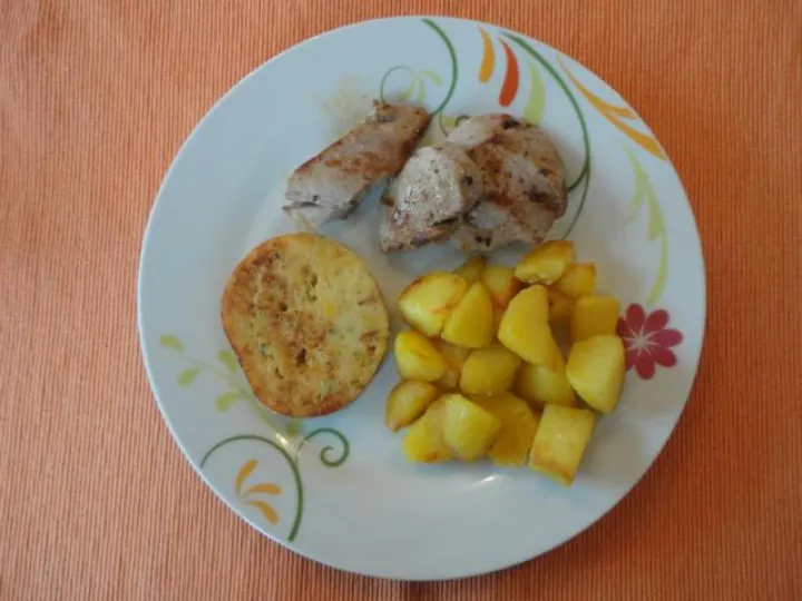 Als Beilage gab es hier Bratkartoffeln und angebratene Serviettenknödelscheiben (da sie vom Vortag übrig waren), aber die Erdäpfel reichen vollkommen aus.