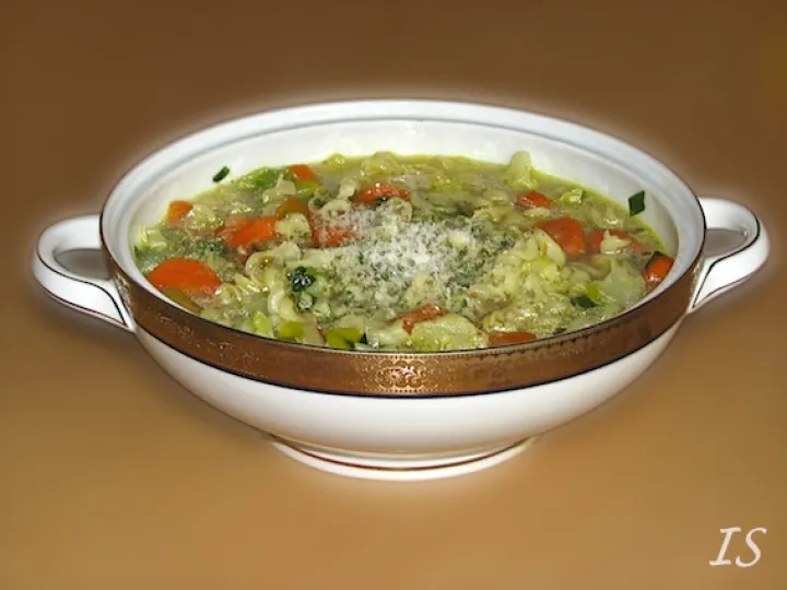 Alle Gemüse zugeben und mit der Suppe auffüllen. Bei mittlerer Hitze zugedeckt 10 – 15 Minuten garen.