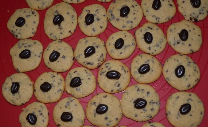 Mokkabohnen auf der Unterseite mit der erwärmten Schokolade bestreichen und in die Mitte der ausgekühlten Taler setzen.