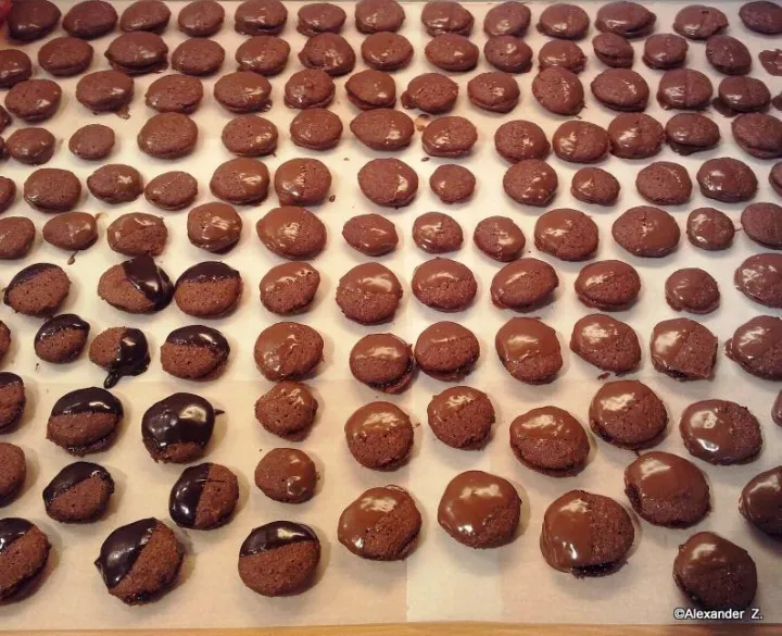 Zum Schluß die Schokolade erwärmen und die Busserl zur Hälfte tunken und fest werden lassen.