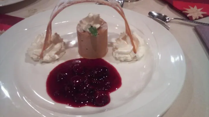 Eier, Dotter und Staubzucker über Dampf schaumig schlagen. Masse kaltschlagen. Nougat schmelzen und unter die Masse ziehen. Schlagobers schlagen und unterheben. Masse in die Förmchen füllen und mindestens 3 Stunden tiefkühlen.