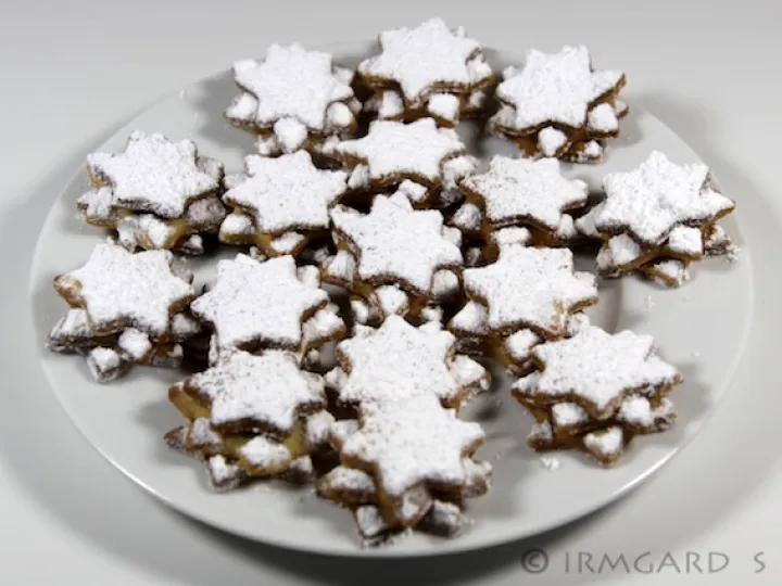 Teig auf einer bemehlten Arbeitsfläche ausrollen und Sterne in unterschiedlicher Größse ausstechen. Auf ein mit Backpapier ausgelegtes Backblech legen und bei 175° ca. 12 Minuten backen.