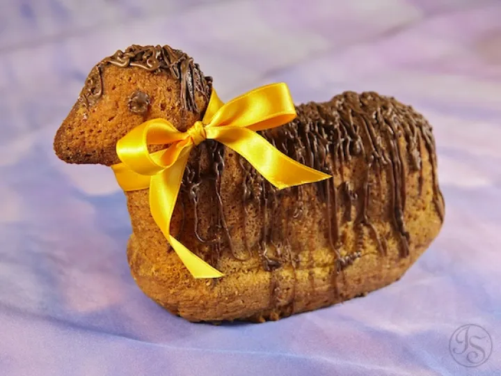 Das Lamm in der Form erkalten lassen. Boden gerade abschneiden und mit geschmolzener Schokolade verzieren.