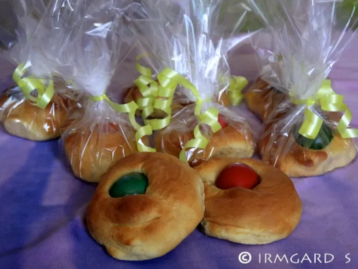 Teig auf einer bemehlten Arbeitsfläche nochmals kurz durchkneten, teilen und jedes Stück zu einer Rolle und dann zu einem Ring formen. Ein gefärbtes, gekochtes Ei in die Ringmitte legen und dann bei 50° im geöffneten Backrohr nochmals gehen lassen.