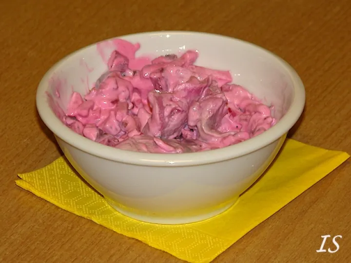 Den Rahm mit Salz und Pfeffer abschmecken und mit den Heringstücken, roten Rüben, Sellerie- und Apfelstücken und den Gurkenscheiben gut vermengen, den Heringssalat in einer Schüssel anrichten und mit gehacktem Ei bestreuen.