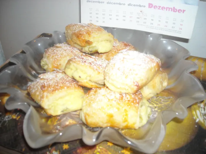 Teig ausrollen, 8 x 30 cm breite Streifen schneiden, in der Mitte die Fülle aufdressieren, einrollen und dann ca. 20 gleich große Stücke schneiden, jedes Stück 3 mal schräg einschneiden, mit Ei bestreichen, Mandelblättchen draufstreuen, gehen lassen, danach bei 170° C, ca. 15 Minuten backen.