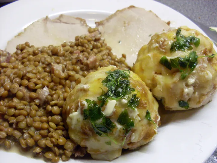 Die Semmelknödel in Margarine und Petersilie schwenken und mit den Linsen servieren.