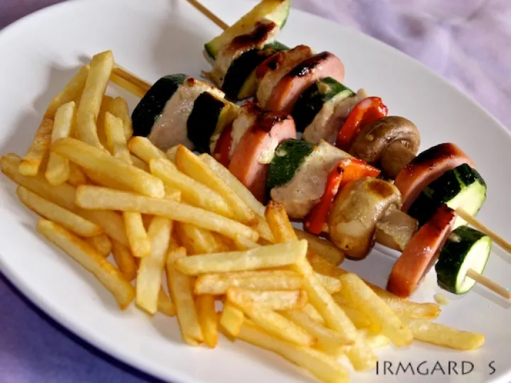 Die Putenschnitzel und die übrigen Zutaten in etwa gleich große Stücke schneiden und je nach Geschmack auf einen Holzspiess stecken.