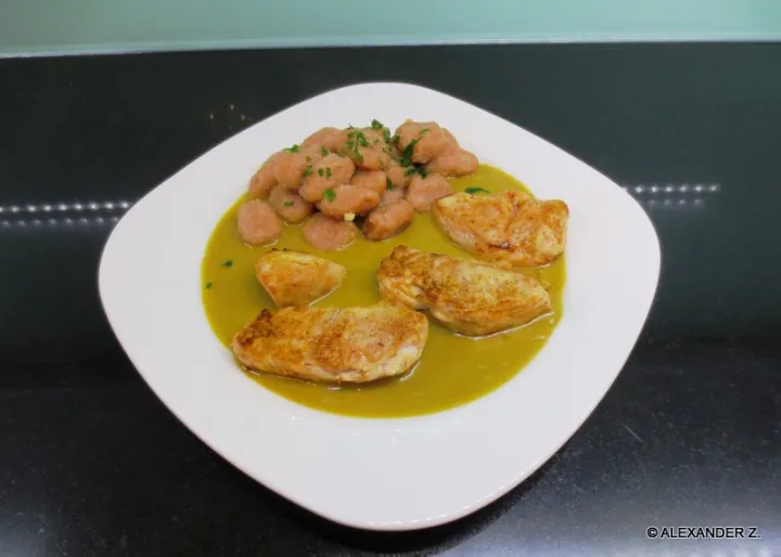 Zwischenzeitlich das Fleisch in kleine Stücke scheiden mit Salz, Pfeffer und etwas Paprikapulver würzen und in einer beschichteten Pfanne anbraten. Daneben gleich die Gnocchi ins kochende Salzwasser geben und für ca. 10 min kochen lassen.