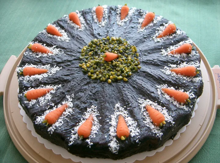Die Mitte der Torte mit gehackten Pistazienkernen und den Rand mit den Marzipanmöhren garnieren.