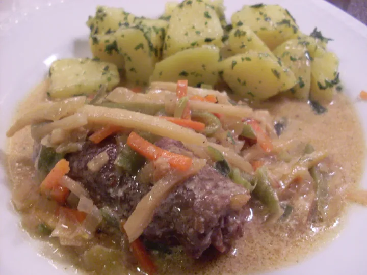 Im Bratenfond dann die Zwiebeln leicht anschwitzen und mit 500 ml Rindsuppe ablöschen. die Rouladen wieder einlegen , das restliche Gemüse und die Kapern dazugeben und zugedeckt 30 Minuten weichdünsten.