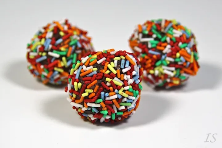 Dann kleine Kugeln formen und diese in Zuckerstreusel wälzen.