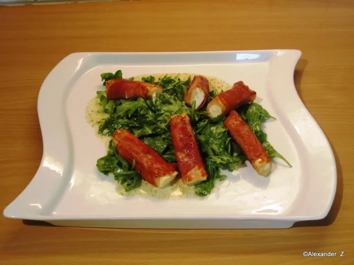 Im Anschluss das Kernöl dazugeben und den Rucola damit marinieren und auf ein Teller geben.