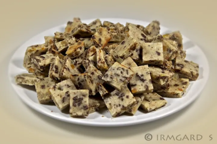 Auskühlen lassen und in beliebige Stücke schneiden.