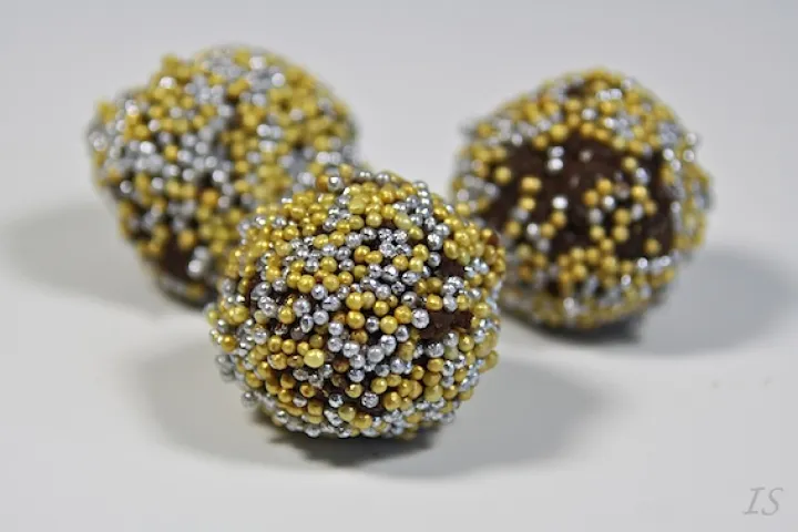 Abkühlen lassen, kleine Kugeln formen und diese in einer Zuckerperlenmischung wenden.