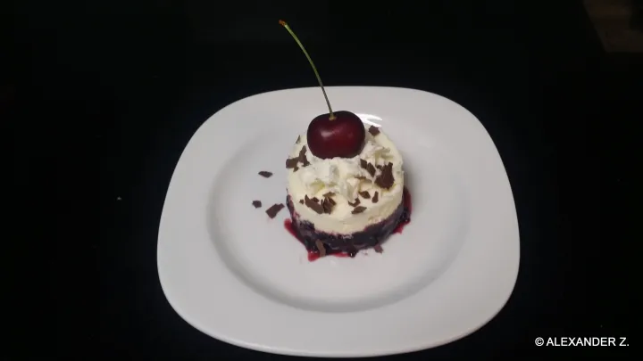 Mit dem Stempel die Törtchen vorsichtig von unten nach oben herausschieben. Das restliche Schlagobers mit der Sterntülle auf die die Törtchen verteilen und die Kirschen aufsetzen. Mit den Schokoplättchen garnieren.