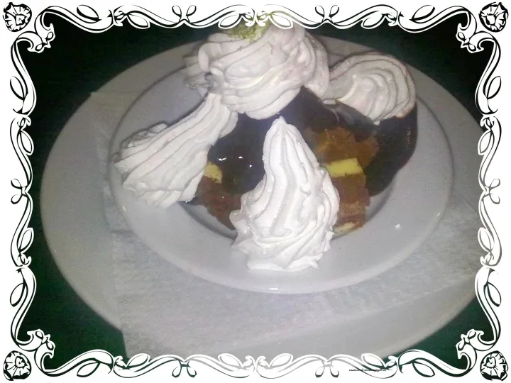 Den Schichtvorgang wiederholen, bis alle Zutaten verbraucht sind. Die Mehlspeise nun einige Stunden in den Kühlschrank stellen und danach mit dem Löffel Nockerln ausstechen, auf einem Teller mit der Schokosoße anrichten, und mit Schlagsahne verzieren.