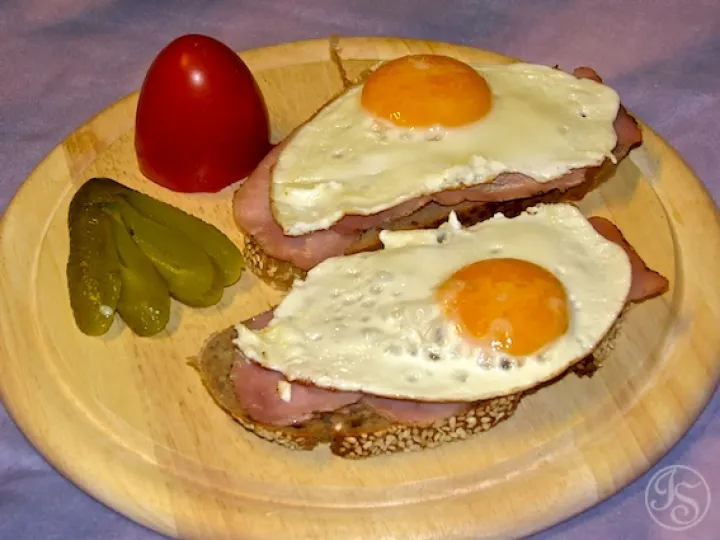 Das Spiegelei in der Pfanne mit dem Öl oder dem Butterschmalz zubereiten und auf den Schinken legen.