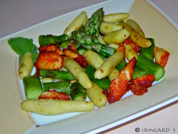 Die Fischstücke, den Spargel und die Schupfnudeln zusammen in einer Pfanne vorsichtig mischen und ev. nachwürzen.
