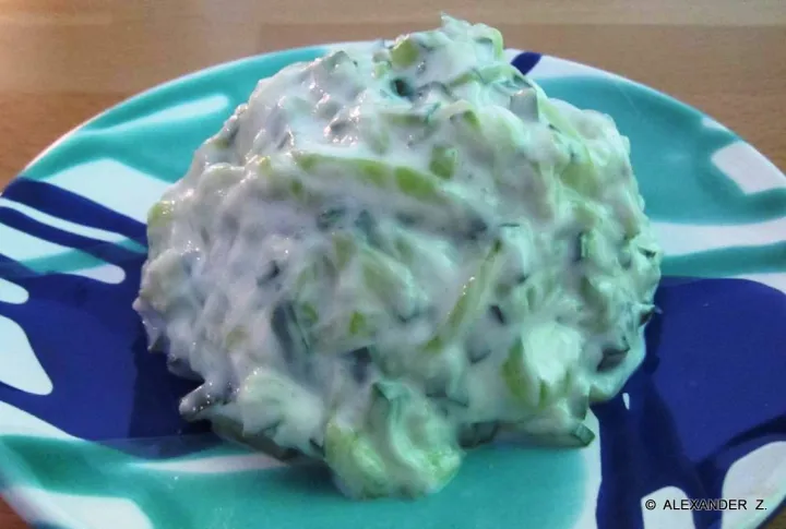 Die Salatgurke in dünne Streifen hacheln, einsalzen (Das Salz entzieht der Gurke etwas Wasser und verhindert, dass das Tsatsiki dann zu dünn wird) und 10 min stehen lassen. Anschließend die Gurken etwas auspressen, das Joghurt und den Knoblauch dazugeben und mit dem Dill und ggf. noch etwas Salz abschmecken.