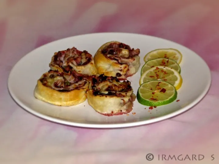 Den Blätterteig aufrollen und ca. 3 cm breite Stücke abschneiden.