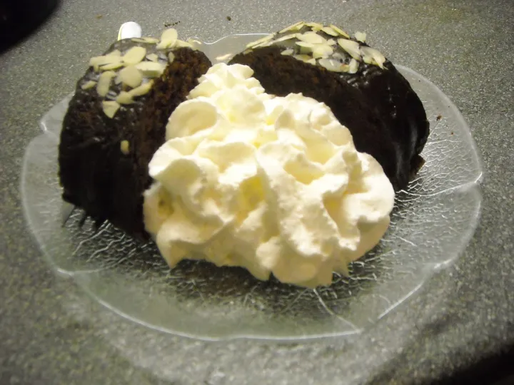 Den erkalteten Kuchen mit der Schokoglasur überziehen und mit Mandelblättchen bestreuen.
