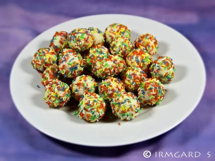 Kalt werden lassen und dann kleine Kugeln formen und diese in buntem Schokostreusel wälzen.