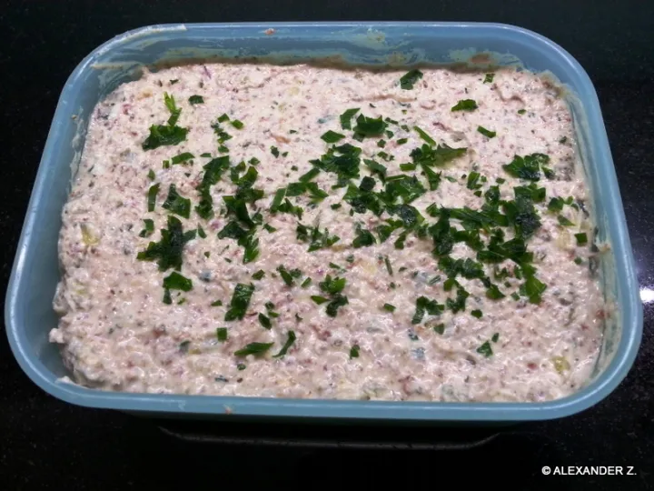 Zwiebel, Gurkerl und Petersilie fein hacken und in den Topfen einrühren. Das Wursthaschee zugeben und mit Salz, Pfeffer und Gurkenwasser abschmecken. Um den Aufstrich noch etwas cremiger zu machen, abschließend noch einen Schuss prickelndes Mineralwasser einrühren.